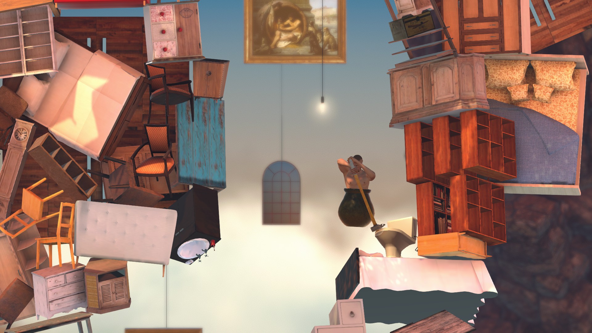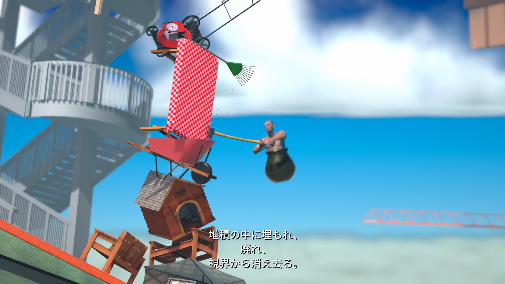 途中の台から穴を飛び越えて、そびえ立つ道具の山へ。