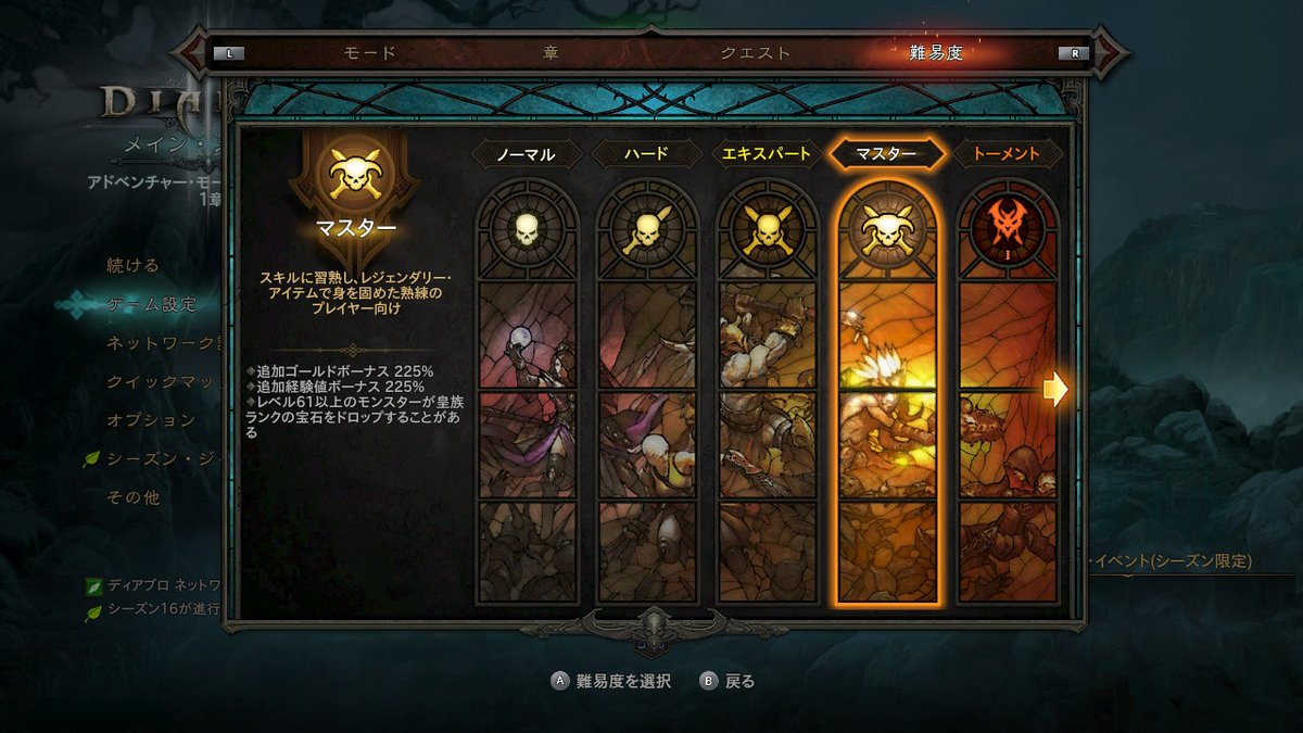 装備の更新が終わったら、難易度をトーメント1以上に上げます。